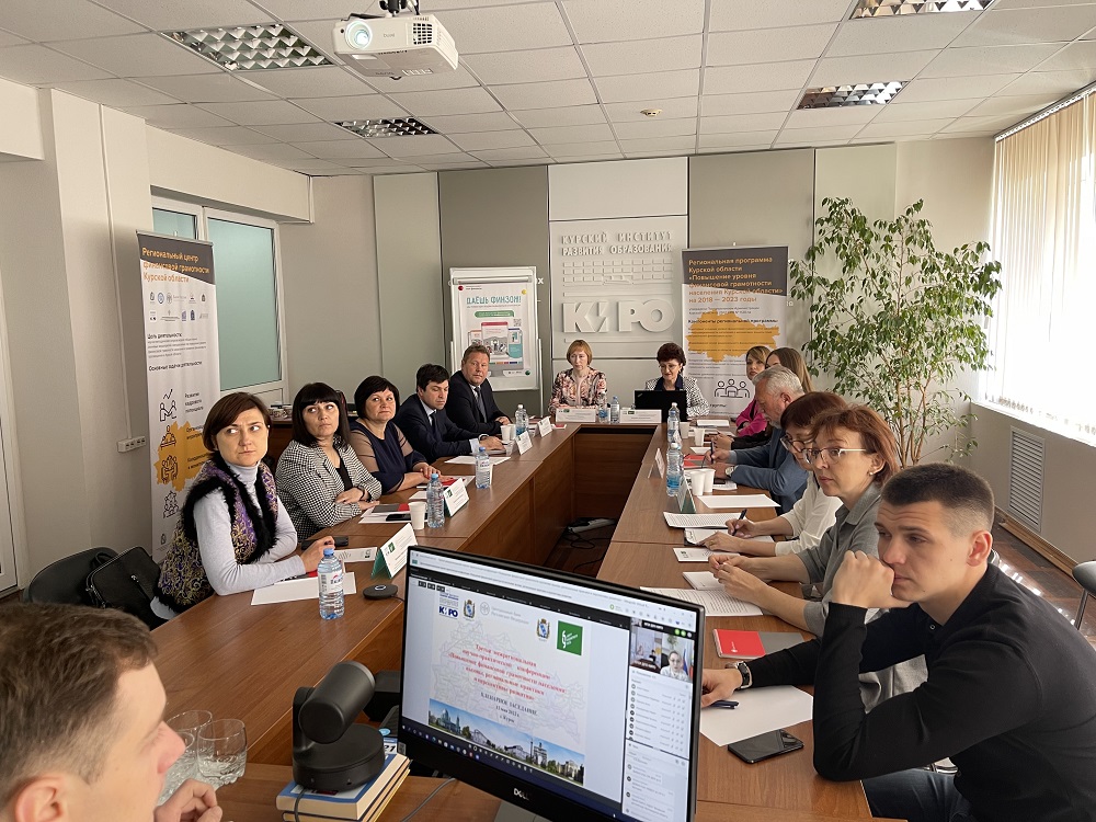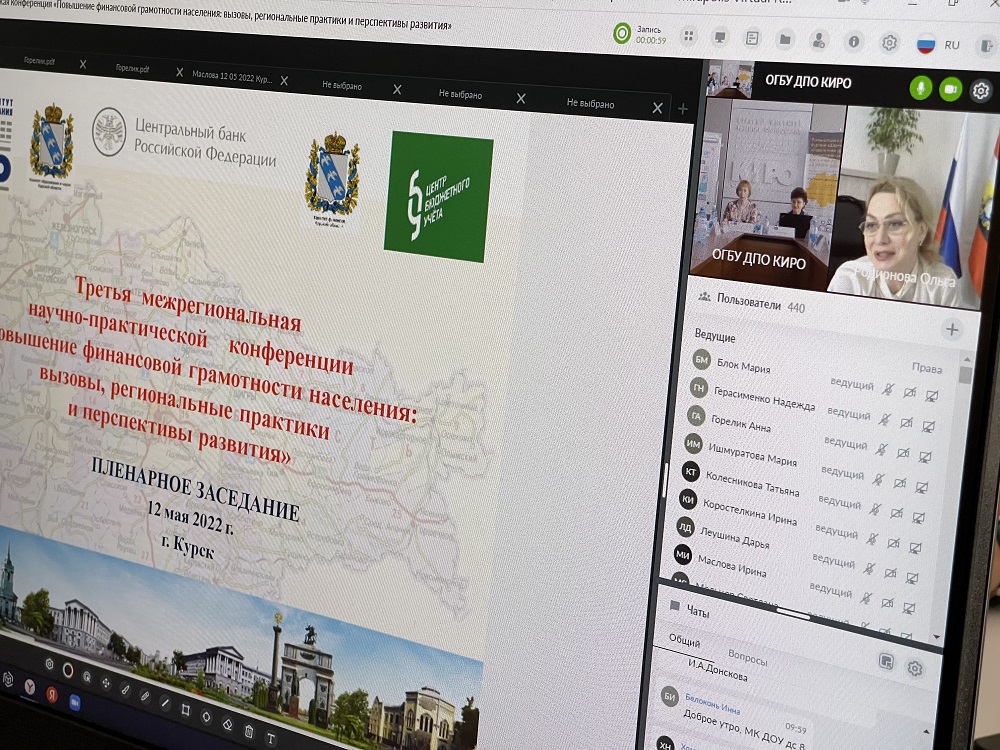 12 мая 2022 года в ОГБУ ДПО «Курский институт развития образования» была проведена Третья Межрегиональная научно-практическая конференцию «Повышение финансовой грамотности населения: вызовы, региональные практики и перспективы развития». Организаторы конференции: комитет образования и науки Курской области, комитет финансов Курской области, Отделение Курск Банка России. Программа мероприятий конференции включала пленарное заседание и работу двух секций. К работе конференции в режиме видеоконференцсвязи присоединилось около 500 участников из 19 субъектов Российской Федерации, а также Республики Беларусь. Участниками конференции стали представители 7 федеральных округов: Центрального (г.Москва, Белгородская, Брянская, Курская, Липецкая, Воронежская, Тамбовская, Ярославская области), Северо- Западного (Архангельская, Вологодская, Калининградская Мурманская области), Приволжского (Саратовская область), Южного ( Краснодарский край), Северо-Кавказского (Ставропольский край),Уральского (Тюменская область), Сибирского (Алтайский, Красноярский края).